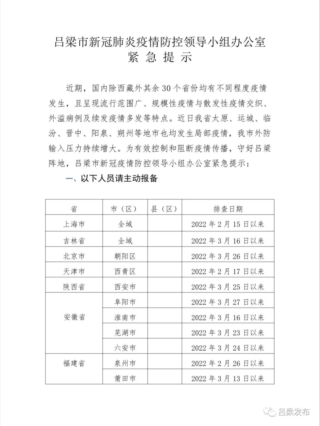 * 查詢呂梁市各區(qū)域的疫情風(fēng)險等級。